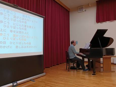 今回も私の司会で、「リンゴの唄」から始まり、イントロ当てクイズでは正解者にマカダミアナッツチョコの景品もあり、「ハナミズキ」ではお茶漬けシスターズの歌とフラもありと、「365歩のマーチ」まで盛りだくさんの1時間、集まってくださった36人の方と楽しい時間を過ごしました。