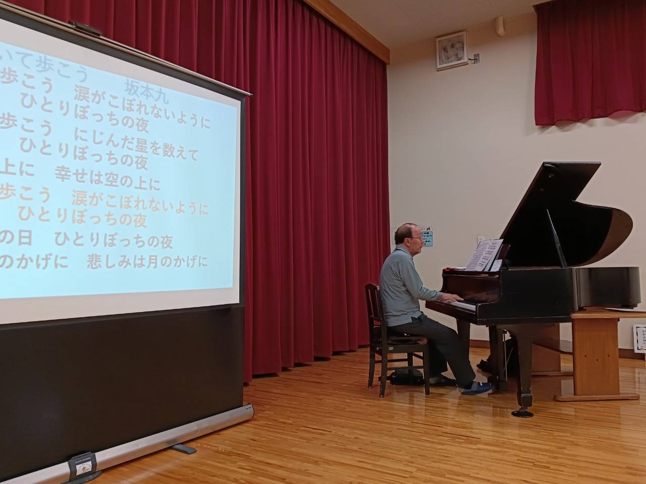 南山苑の演奏会で私が司会をしたところ、私のことを気に入ってくださり、今度は福井で演奏会をしたいと言われたことから、福井での会場探しが始まりました。次の来日が11月ということで、時期的にインフルエンザの流行が気になり、老人ホームや病院よりも公民館の方がいいだろうなと思っていたところ、越前市の武生東公民館にグランドピアノがあるという情報が!さっそく公民館に伺いお願いすると快諾してくださいました。ただ、70年以上前のピアノなので、調律はしているけれど音がずれるかもしれないとのこと。南山苑のピアノも古くて音がずれていてデールさんが苦心して弾いていたので、一抹の不安がありました。